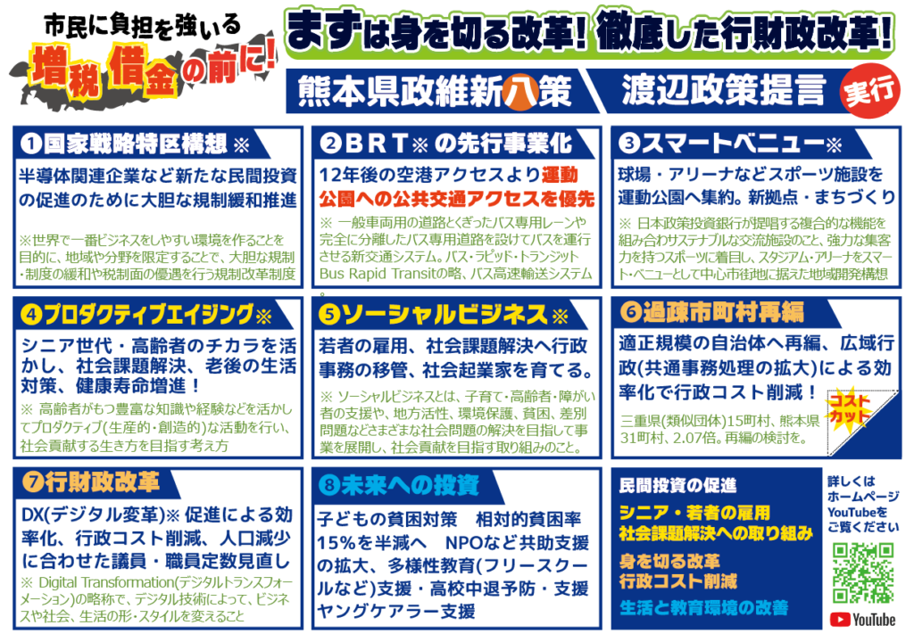 ○TSMCの進出(菊陽町)に関連した国家戦略特区構想=規制緩和による更なる投資の呼び込み、空港周辺の開発、企業誘致などによる人口の安定、雇用・定住の促進など税収益を上げる施策の推進や、社会課題である子どもの貧困対策、シニア世代のマンパワーの活用、都市部の渋滞緩和、人口減少自治体の課題、広域行政推進、財政再建など地域課題解決や行政コストの削減に取り組んで参ります。