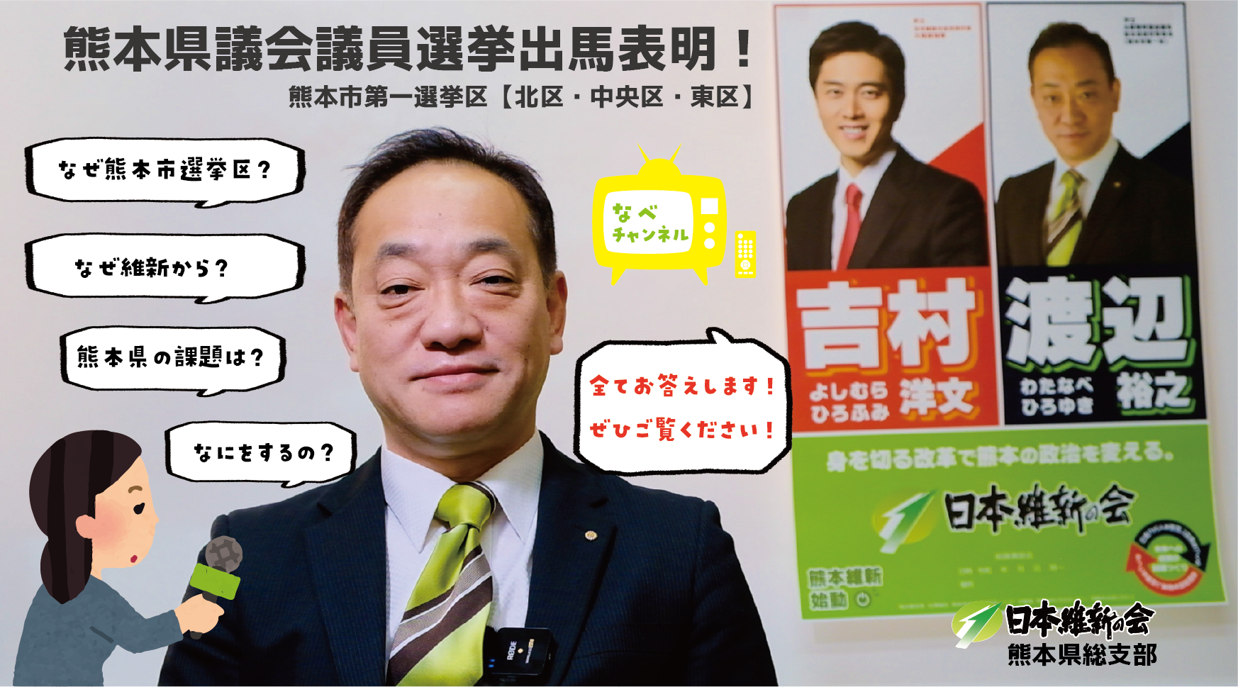 熊本県議員選挙出馬表明! お知らせ 2023.01.29 熊本県議員選挙出馬へのきっかけ、選挙区について、そもそも政治家を志した訳、なぜ日本維新の会なのか?等々、渡辺裕之の思いを熱く表明させていただきます! 関連